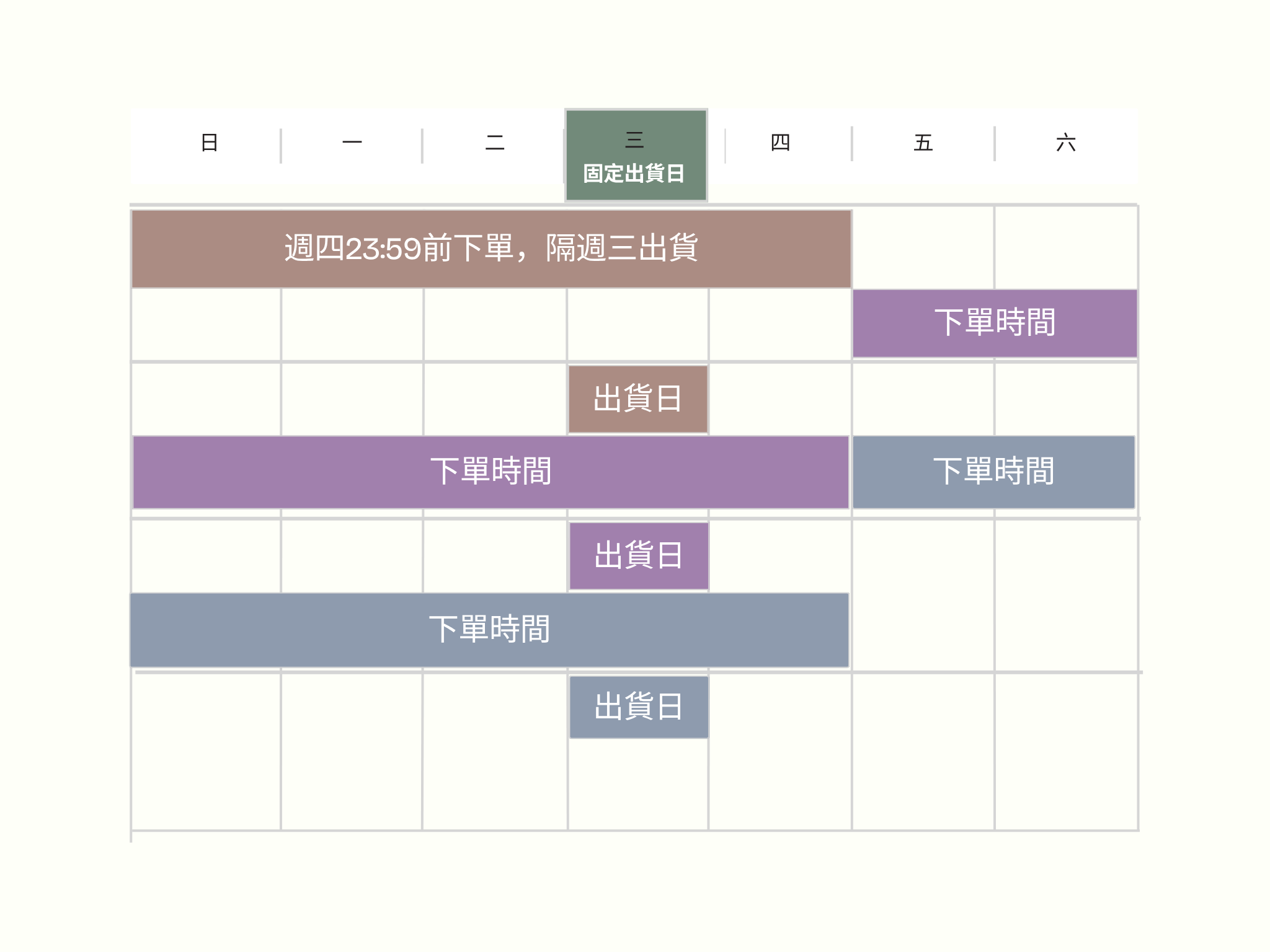 若遇節慶訂單較多或不可抗力天災因素,導致延遲出貨將另行通知。