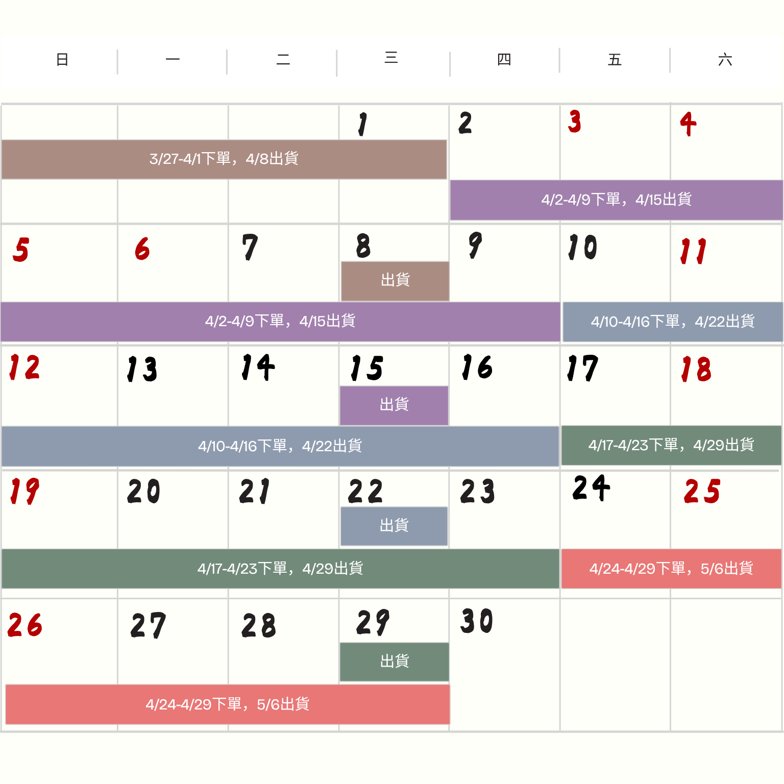 4/17-4/23下單,出貨日期:4/29,感謝您的耐心等待。