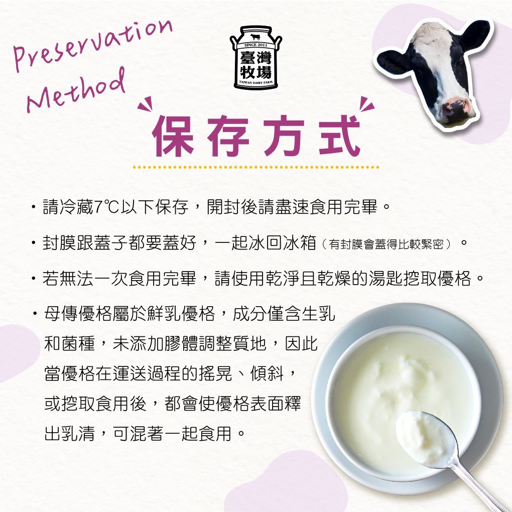 原料:100%生乳, 活性乳酸菌(保加利亞乳酸桿菌 Lactobacillus delbrueckii subsp.bulgaricus, 嗜熱鏈球菌 Streptococcus thermophilus)(品質符合CNS3058)